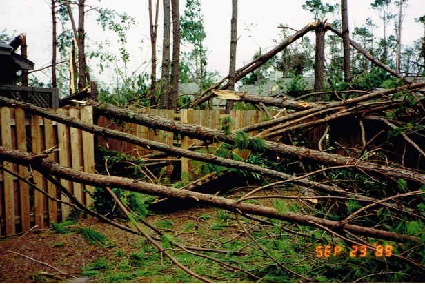 The next day it looked like a war zone. I can still smell pine sap and hear chain saws. We walked deep in the back yard and spotted the path of a tornado that had come through the back yard between our backdoor neighbors. It didn’t hit the house, but was super close!