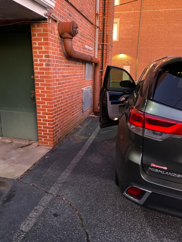 Since Tim is the careful driver in the family, I decide that I needed to drive so I can try to make up time. I drove like a race car driver skidding into the church parking lot hot, on two wheels. I turn into the main parking lot and head towards back, to get to the auxiliary parking lot. I spot the VERY last parking spot. This spot is snug against a brick wall.