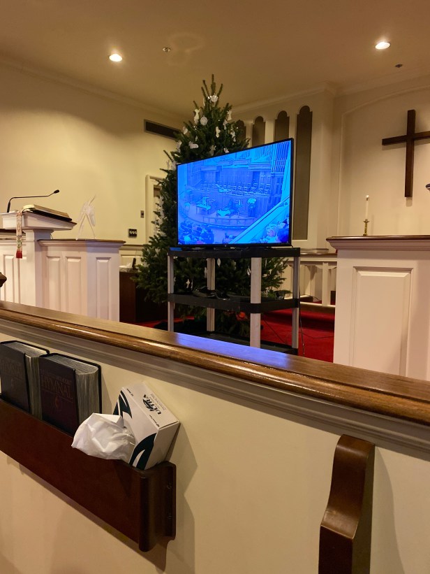 Y’all won’t believe this, we end up in the Chapel. Yes, the overflow room. We have never sat in the chapel before. This felt like punishment. It reminded me of a funny episode of “The Middle” where they ended up in the 4th overflow room for Christmas Eve service.