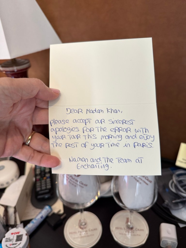 The we headed back to the hotel to shower and sneak in a nap before the evening’s plans. When we walked into the room, we found a thoughtful surprise from Naman—a bottle of wine and a handwritten apology note for the mix-up. It was such a kind gesture and made us feel truly taken care of.