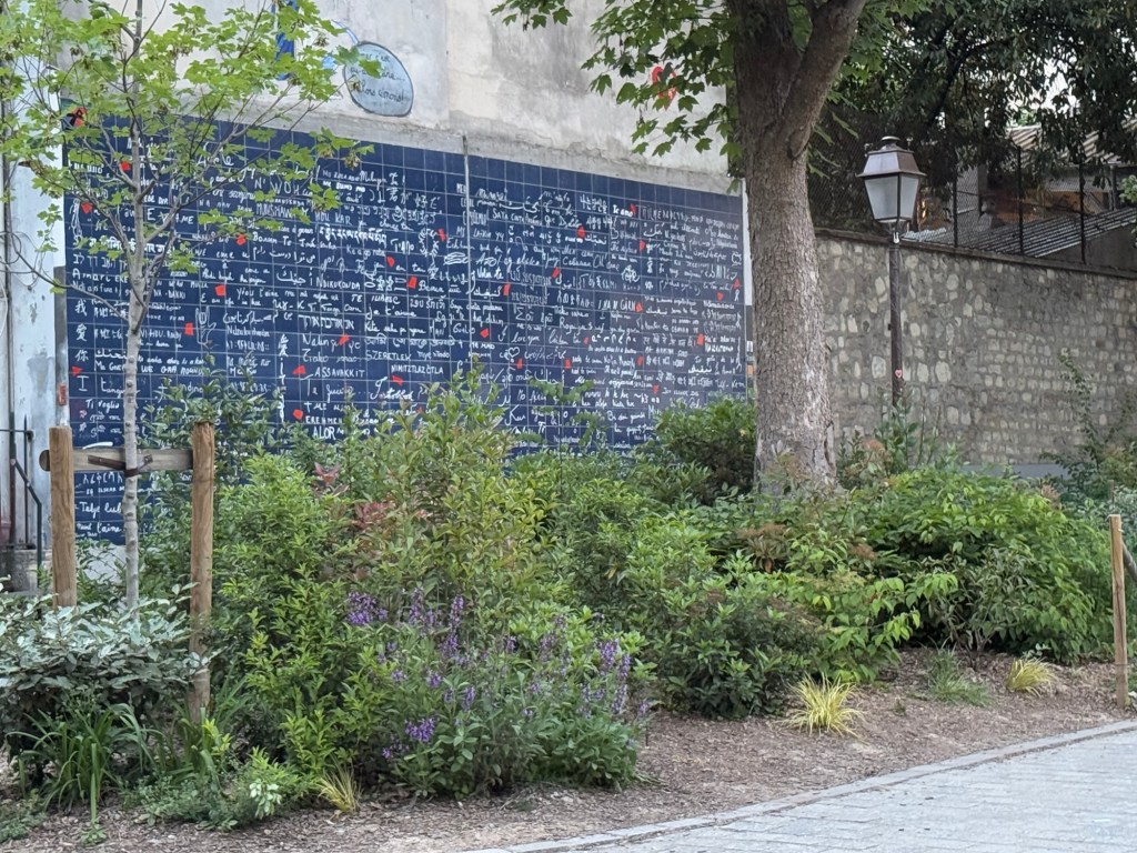 The I Love You Wall in Montmartre was created in 2000 by artist Frédéric Baron and calligrapher Claire Kito. It features “I love you” written over 300 times in 250+ languages on dark blue tiles. The red shapes represent pieces of a broken heart, symbolizing love’s power to heal.