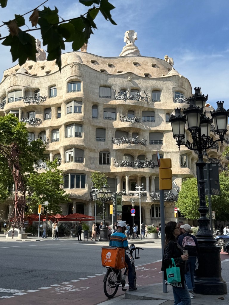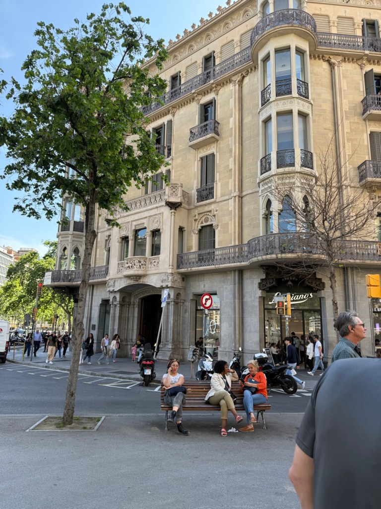 As we strolled through Eixample, she explained that this area is actually preferred by locals. While the Gothic Quarter draws the tourists, Eixample—with its wide, elegant streets and neat grid layout—feels more open and livable. She pointed out that the corners of buildings are angled to soften intersections and make room for gathering spaces. We also learned how homes were designed by class: the wealthiest families lived on the first floor (above the shops), while the help and renters lived farther up—less convenient and definitely less prestigious.