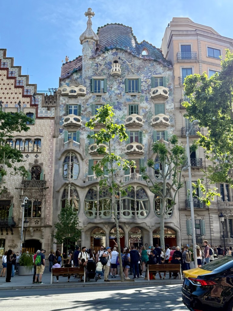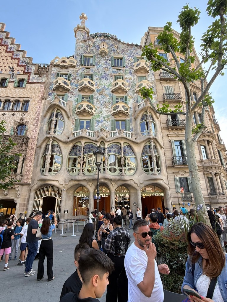 The result is Casa Batlló, one of the most iconic buildings in Barcelona. We crossed the street to take it all in, and that’s when the details really hit us. The roof curves like a dragon’s back, covered in shimmering scales, and the cross-shaped tower is said to be Saint George’s sword plunged into the dragon. The balconies look like skulls or masks, giving the whole thing a surreal, almost spooky vibe.