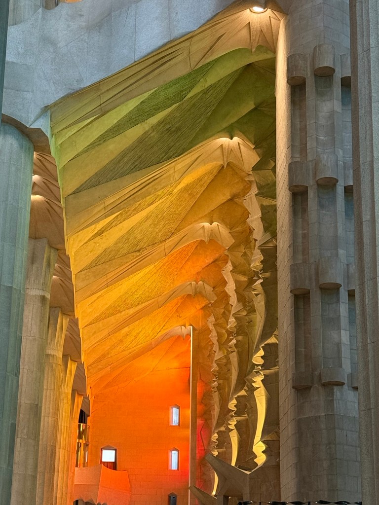 Inside, Gaudí’s genius really hits you. The stained glass is arranged by direction and time of day—cool blues and greens on the east side to catch the morning light, and warm reds and oranges on the west to glow with the afternoon sun. As the light moves through the space, it transforms everything. It’s like being inside a kaleidoscope of color and shadow.