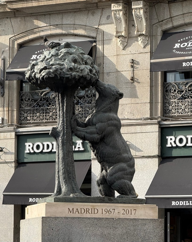 As we made our way through the plaza, we passed the official symbol of Madrid. A quirky statue of a bear reaching up to a tree. It’s called El Oso y el Madroño and it’s the official symbol of Madrid. You’ll see it on signs, souvenirs, and even manhole covers. The tree—called a madroño—used to grow all over this area, and the bear was once part of the natural landscape.
