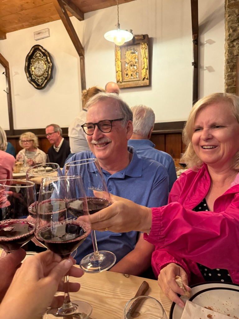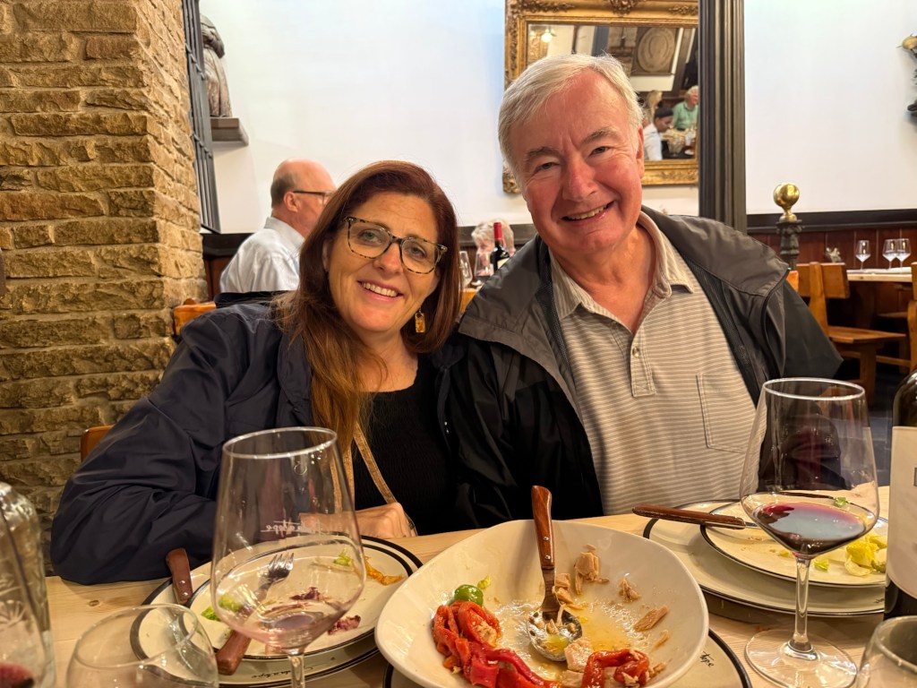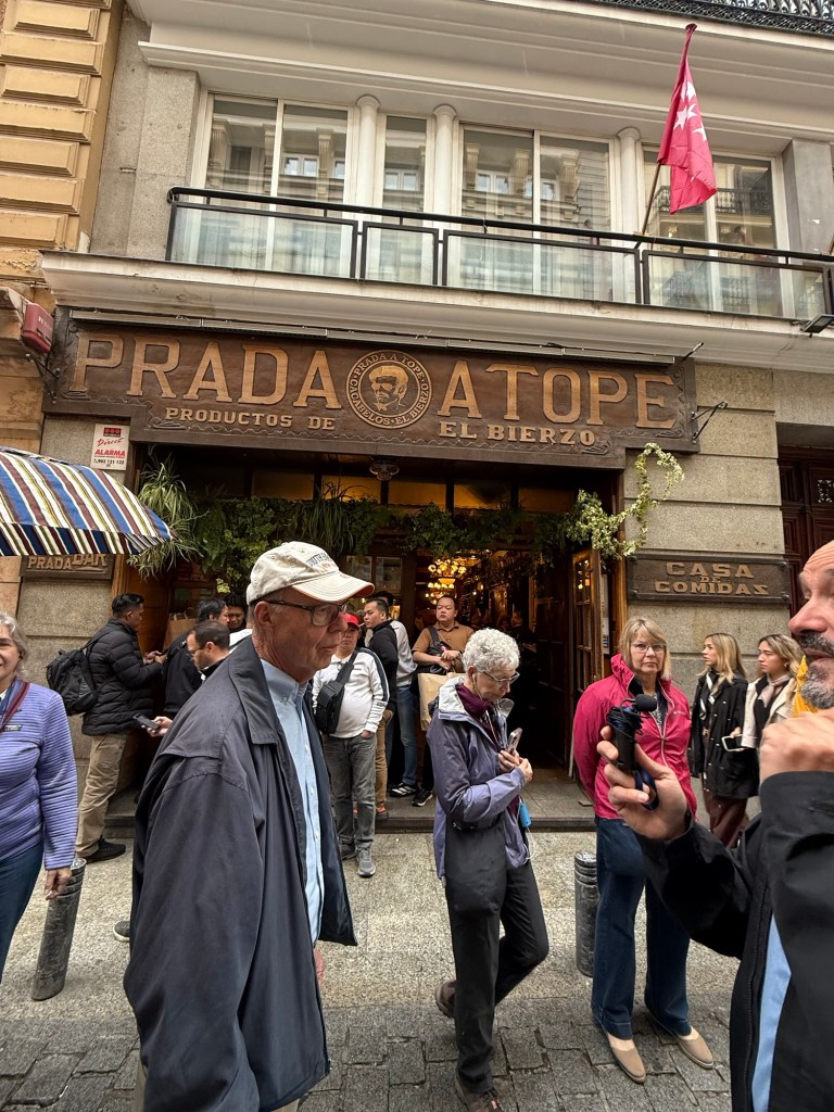 Dinner that night was at Prada a Tope, a rustic spot known for its wine and tapas from northwest Spain. It was packed—but we had a table waiting. Javier even poured our wine for us. The food just kept coming: tapas, more tapas, and some kind of mystery dessert at the end that tasted just like Bailey’s. No one knew exactly what it was, but no one complained.