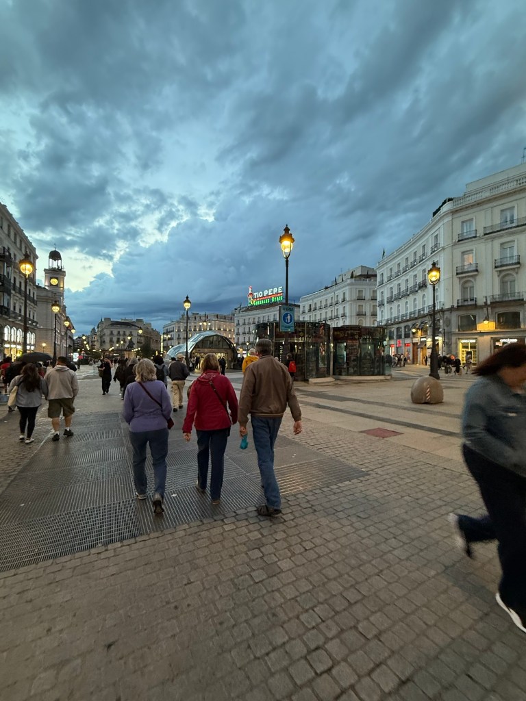 After the museum, we checked into Hotel Europa, right off one of Madrid’s main squares, Puerta del Sol. The name means “Gate of the Sun” because it used to be the eastern gate into the city—where the sun rises. Today, it’s the symbolic center of Spain. There’s even a plaque on the ground marking Kilometer Zero, the official starting point for all the country’s major roads. It’s always buzzing with people—street performers, musicians, protests, celebrations, you name it. If anything’s happening in Madrid, it’s probably happening here.