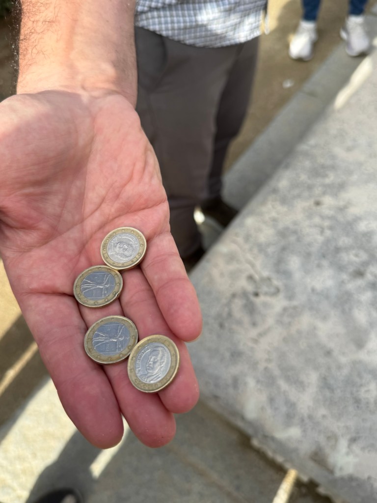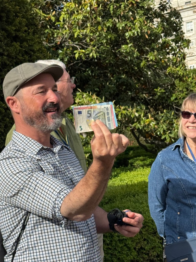 Javier gave us a quick but fascinating lesson on the euro. He opened his hand and held out coins from several EU countries, pointing out how each one has a shared side and a national one. What stood out most: every euro bill is a different size and color, which makes them easier to identify, especially for the visually impaired. It was one of those small but brilliant design choices that just makes sense.