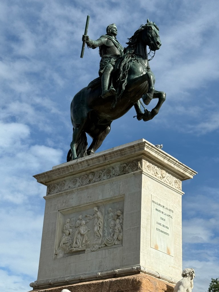 Just before we entered, we stopped at the statue of Philip IV in the palace courtyard. Blanca told us it was the first equestrian statue in the world balanced solely on the horse’s two back legs. People thought it couldn’t be done—the weight would tip it over. But Galileo Galilei helped calculate the physics, and the sculptor cleverly used the horse’s tail as a third support point. You’d never know it by looking at it—it feels like it’s defying gravity. It’s both art and engineering, working together. Blanca smiled and said, “From now on, pay attention to the legs on every equestrian statue you see.” And we have been ever since.