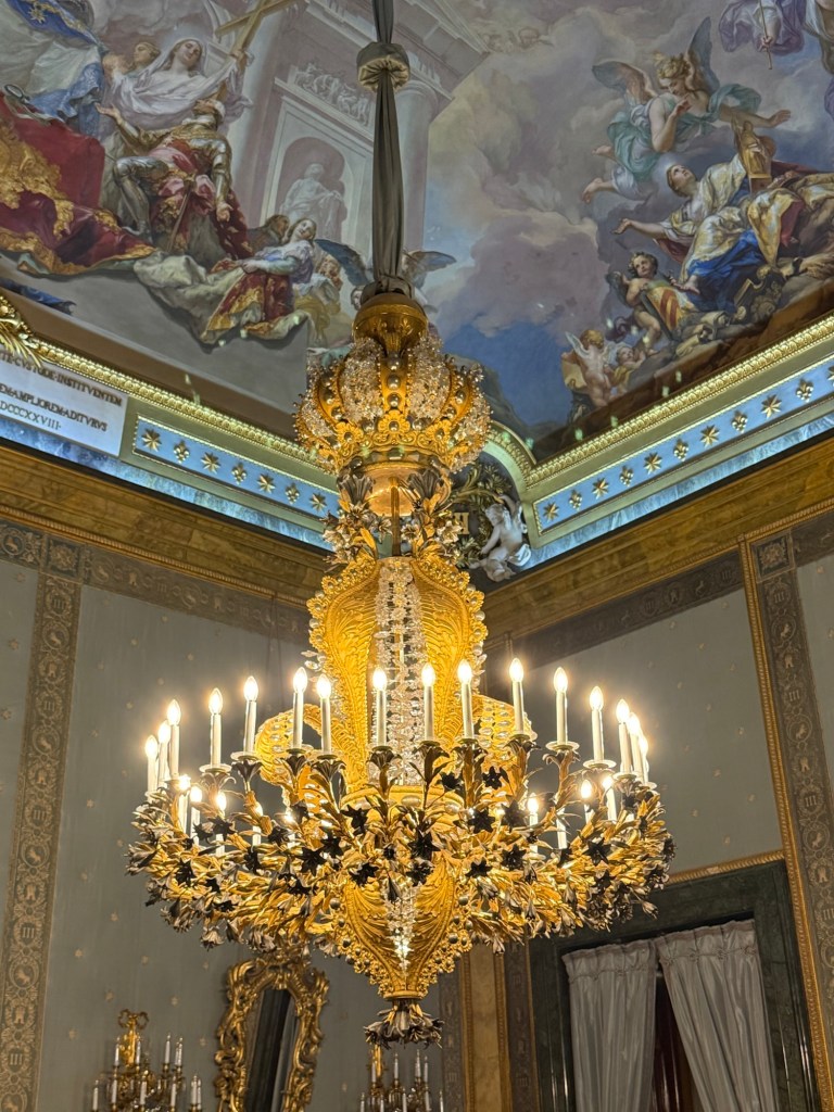 A few steps later, while pointing to a chandelier, Blanca had another story. The original palace burned to the ground on Christmas Eve in 1734. No one died, but some believe it was arson—possibly to make way for the French-style palace King Philip V had envisioned. Guards reportedly rushed in to save furniture, tapestries, chandeliers, even priestly robes. Still debated. Still scandalous.