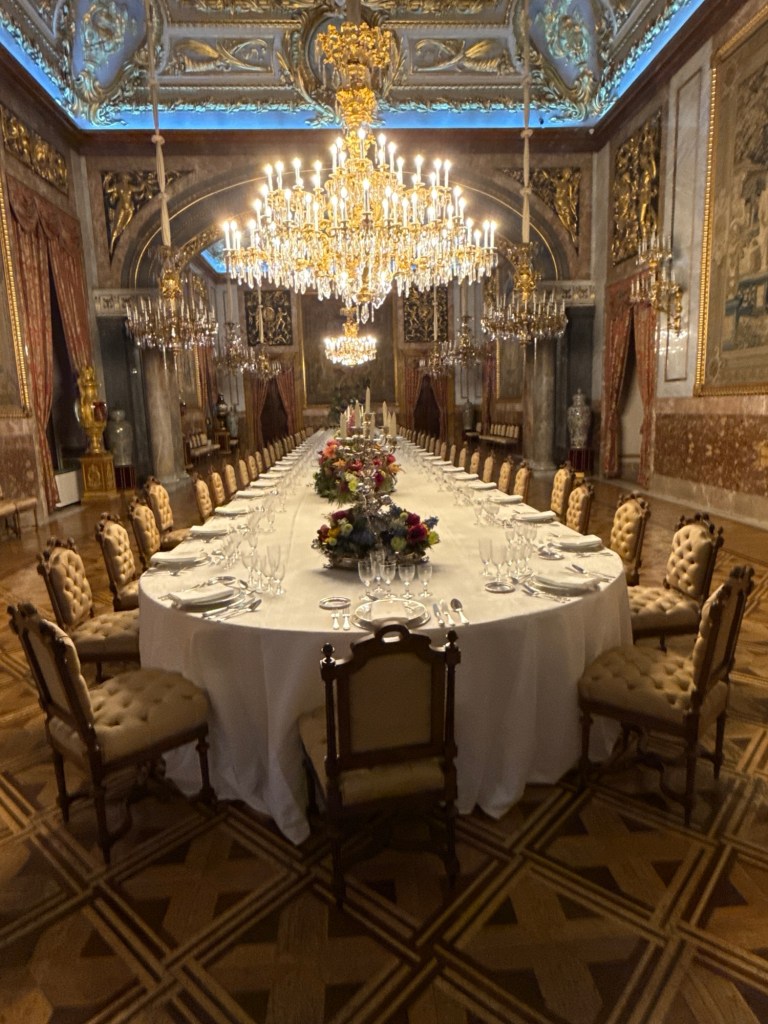 The dining hall was impossible to ignore—one long, formal table stretching through multiple rooms, set with absolute precision. This is where the monarchy still hosts official dinners, and everything from the chandeliers to the china reflects diplomacy in motion. Blanca told us the table can be extended to seat up to 140 guests, depending on the occasion. The king and queen are always seated in the fourth chairs from either end, never at the head, to maintain symmetry and balance—a small detail with centuries of protocol behind it.