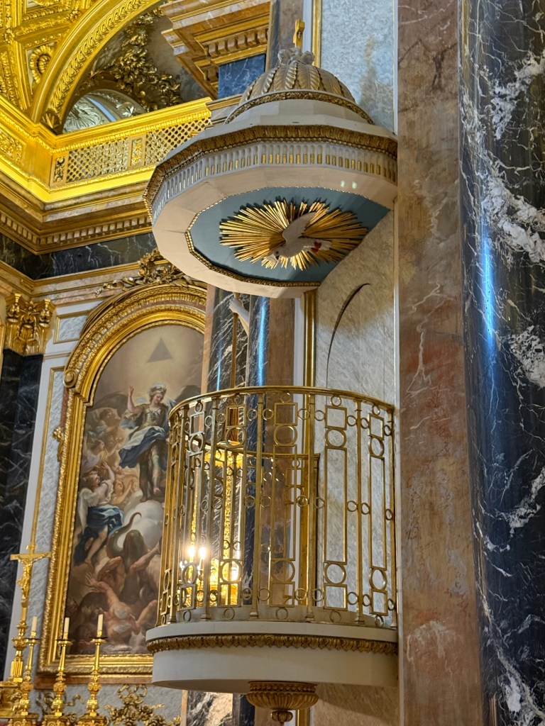 Just before entering the throne room, we paused in the Royal Chapel, which felt calm and reverent. Monarchs would observe mass from their private balcony above the main floor, present but unseen. The sunlight filtering in through the high windows made the whole space feel still.