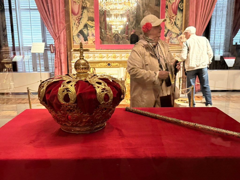 We then visited the room housing the crown and regalia. Spain’s crown is symbolic—never worn—and accompanied by the scepter and ceremonial sword. The Spanish crown weighs about 2 kilograms (4.4 pounds). It’s gold-plated silver with crimson velvet, but it’s never worn—only displayed during official ceremonies.