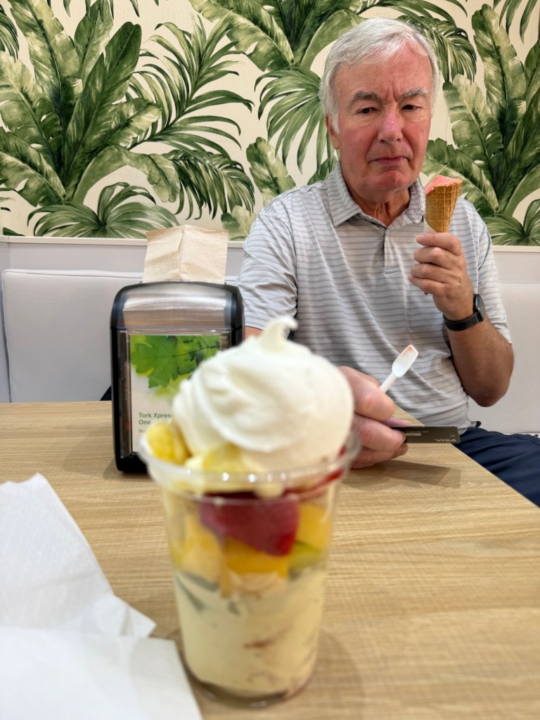 I was still on the hunt for protein and went with chicken—but of course, the dish came swimming in olive oil, which managed to spill all over my pants. Meanwhile, Tim nailed it—he ordered a dish loaded with vegetables, and I was definitely craving those too. As much as we’ve loved the food on this trip, menus continue to be challenging—it’s often a game of guesswork, no matter how many translations you try.