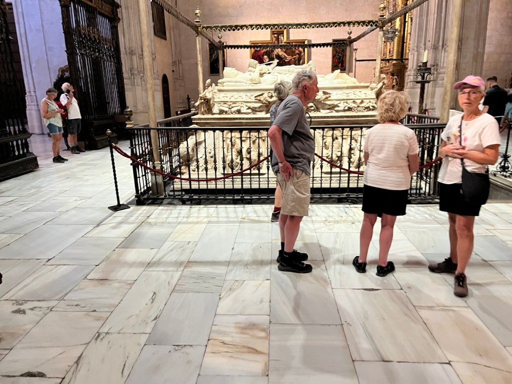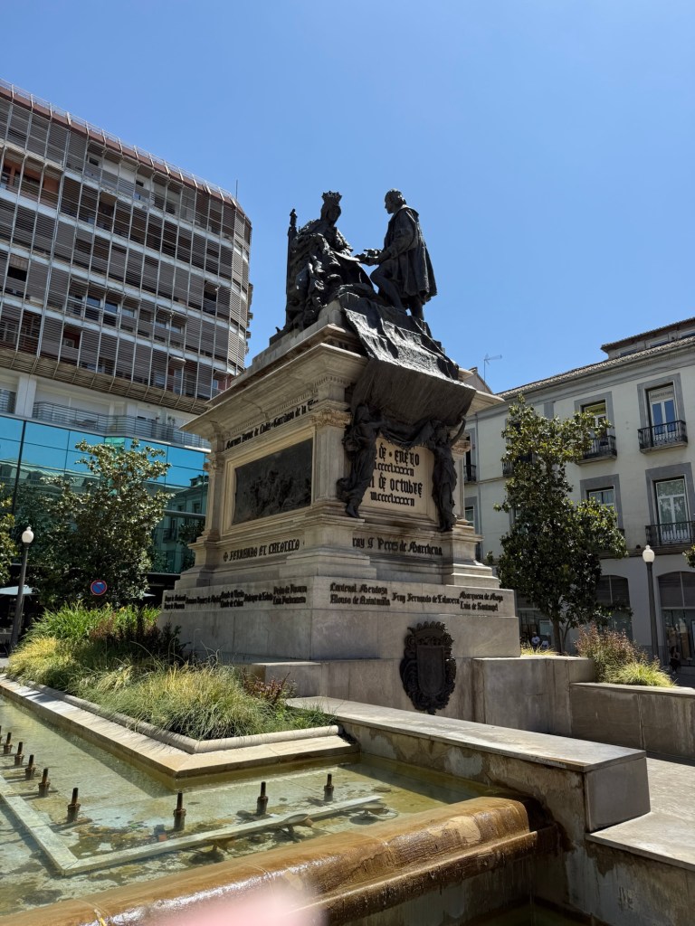 From there, we strolled through the historic heart of Granada toward the Royal Chapel. The walk itself was a treat—narrow cobblestone streets, leafy plazas, and a series of striking statues along the way. One of the most memorable depicted Queen Isabella offering her support to Columbus, a powerful reminder that we were walking through a city layered with history.