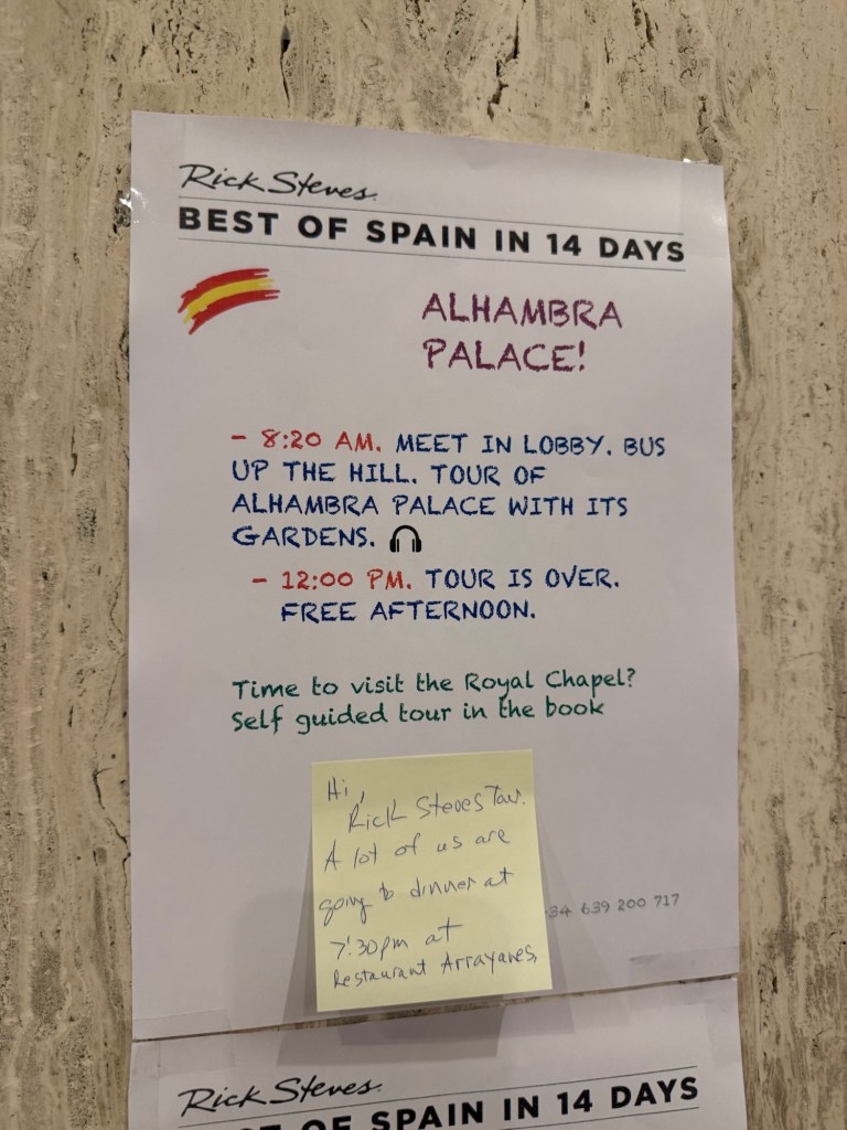 Many of our tour group was following Rick Steves recommendation for dinner Restaurante Arrayanes, a Moroccan spot tucked into a side street in the Albaicín. Rick’s photo was part of a photo collage on the wall, along with other important visitors. We even scored a discount.