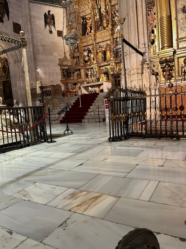 Seeing all four of them entombed here—Spain’s unifiers and their tragically sidelined daughter—gave the chapel this fascinating royal energy. We even saw Isabella’s crown and scepter on display. They were surprisingly modest, yet carried the full weight of empire.