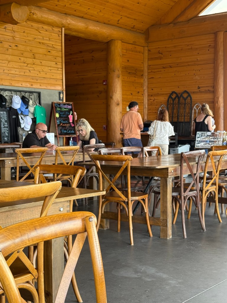 Even the parking lot has vineyard views. The tasting area is open-air and relaxed, with large wooden tables and chairs set up on a covered patio. Itâs casual and mostly self-serve. You order your flight at the counter, then find a table and go at your own pace. No pressure, no frillsâjust a laid-back way to take in the scenery and enjoy the wines.