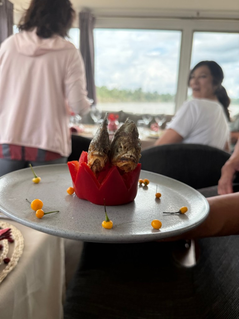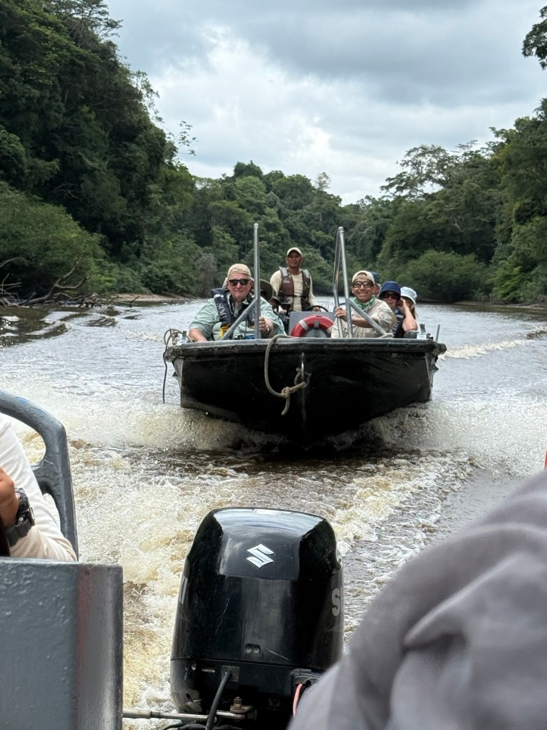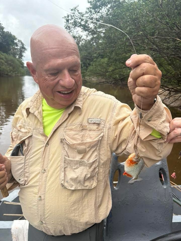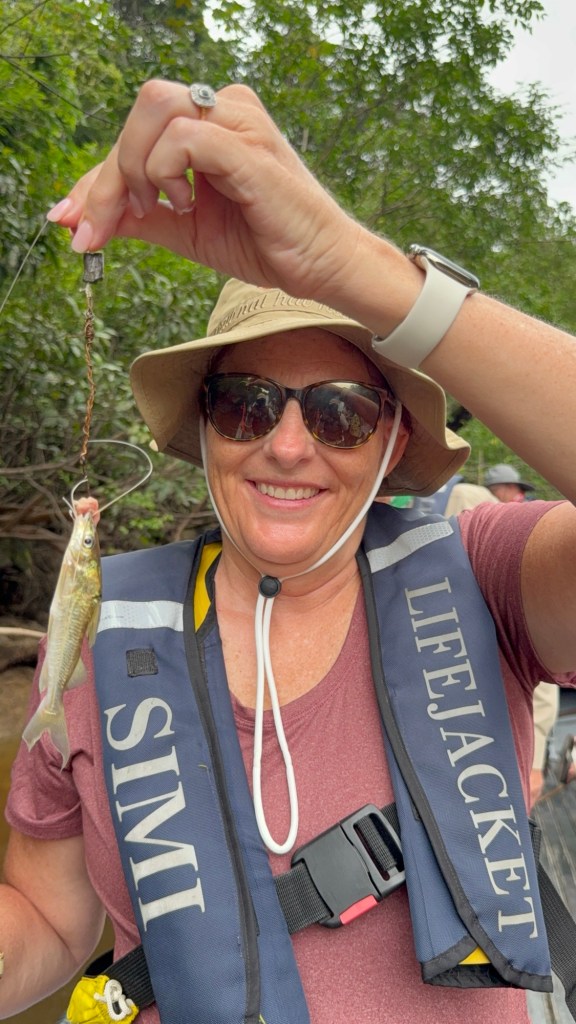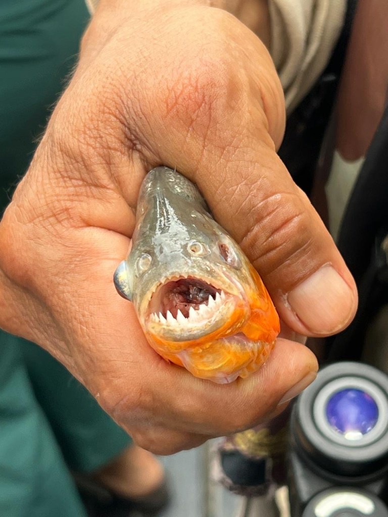 When the second skiff finally appeared, we were able to split up and start piranha fishing. We used small chunks of raw beef as bait and spread out along the edge of the river. I’ve never caught a fish in my life—once I fished in the Delaware Bay with my grandfather and actually had a flounder on the hook, but I didn’t know what to do, so it ate the bait and swam away. This time, I listened carefully to the instructions and caught my very first fish—a tiny river catfish with smooth skin and long whiskers. The guides told us not to touch it because these catfish have sharp, venomous spines near their fins that can cause a painful sting if you grab them the wrong way. The whiskers, called barbels, help them feel their way around and “taste” the water since it’s so murky in the Amazon. The rest of the time, I tried to catch a piranha but had no luck. They nibbled the bait right off the hook and got away every time. Meanwhile, Dr. Gary and our guide were reeling them in one after another, so I focused on grabbing some photos instead.