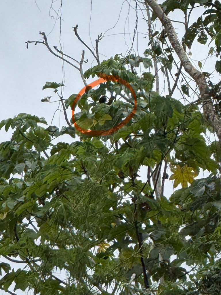 While we wait for the second skiff we look for wild life. First one we spotted was a brown-throated three-toed sloth, its fur a mix of soft browns and grays that blended so well with the bark it almost disappeared. Our guide explained that the Amazon is also home to two-toed sloths, which are slightly larger, lighter in color, and more active at night. The three-toed sloths, like this one, are usually seen during the day, draped over branches and moving at their own unhurried pace. This one barely stirred, just turned its head as if to glance at us before melting back into stillness.