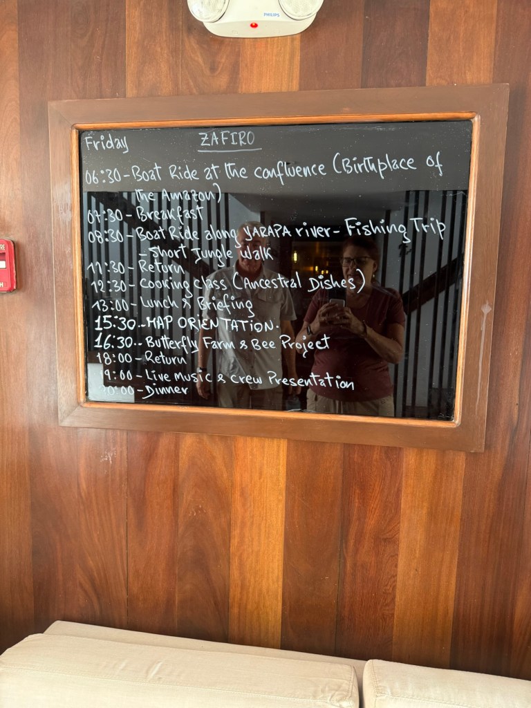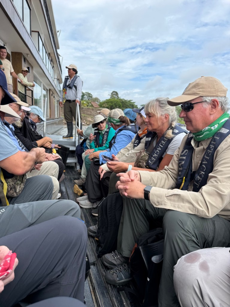 After breakfast, it was time to try on the wellies they had for our jungle walk. I came out to test mine, but immediately noticed a woman stretched out across the benches, one of the areas where we would sit down to try on the boots. I wasn’t sure where she’d come from, but our medic, Marcus, was beside her, administering an IV. She looked distraught. We soon learned she was from a nearby village and had been bitten by a venomous snake called a Fer-de-Lance. The crew quickly used one of our skiffs to rush her to Nauta for medical care, and later to a hospital in Iquitos. Word eventually came that, two weeks later, she was improving little by little.