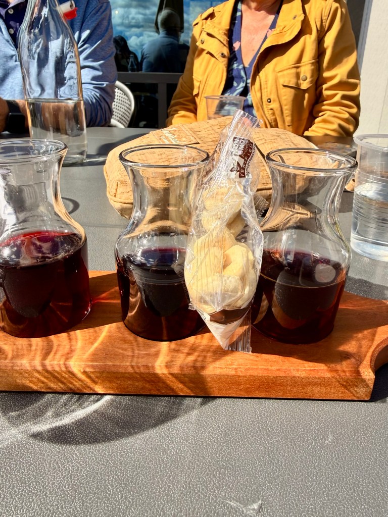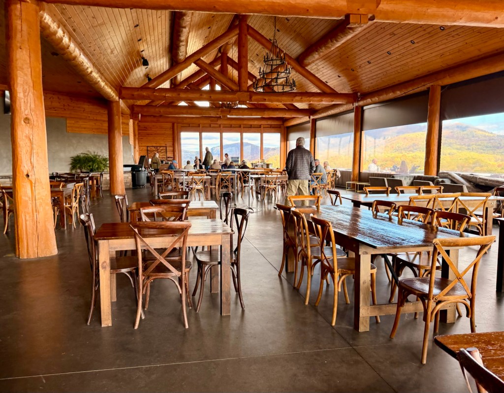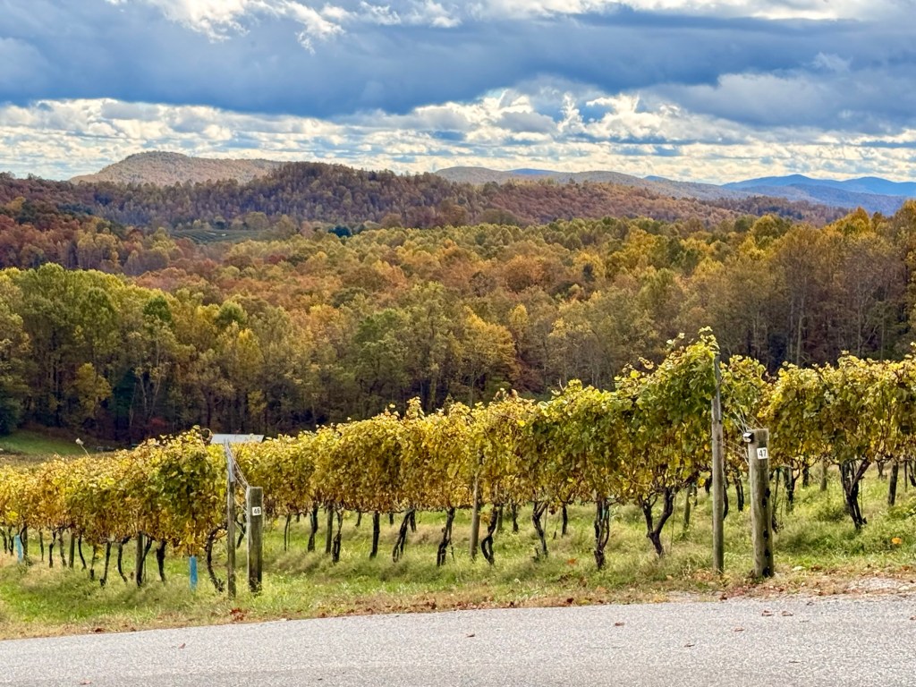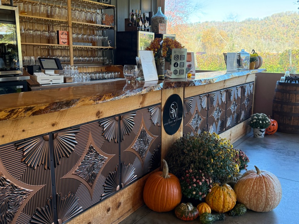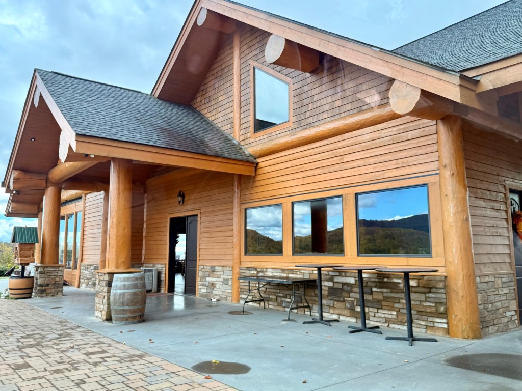 Our first winery stop was Souther Williams Vineyard, tucked in the rolling hills of Henderson County’s Blue Ridge AVA. I rushed in to tell the girl behind the counter how much we loved it last time and that we came back just for their wine. Unfortunately, they were out of our favorite bottle, and her attitude didn’t quite match the warmth I remembered. Still, I admired how the vineyard was built to handle the colder mountain weather—something I’d worried about when we first visited. The setup included clear plastic sides that could be pulled down to block the wind and heaters tucked inside the covered patio, making it cozy even on a chilly day.