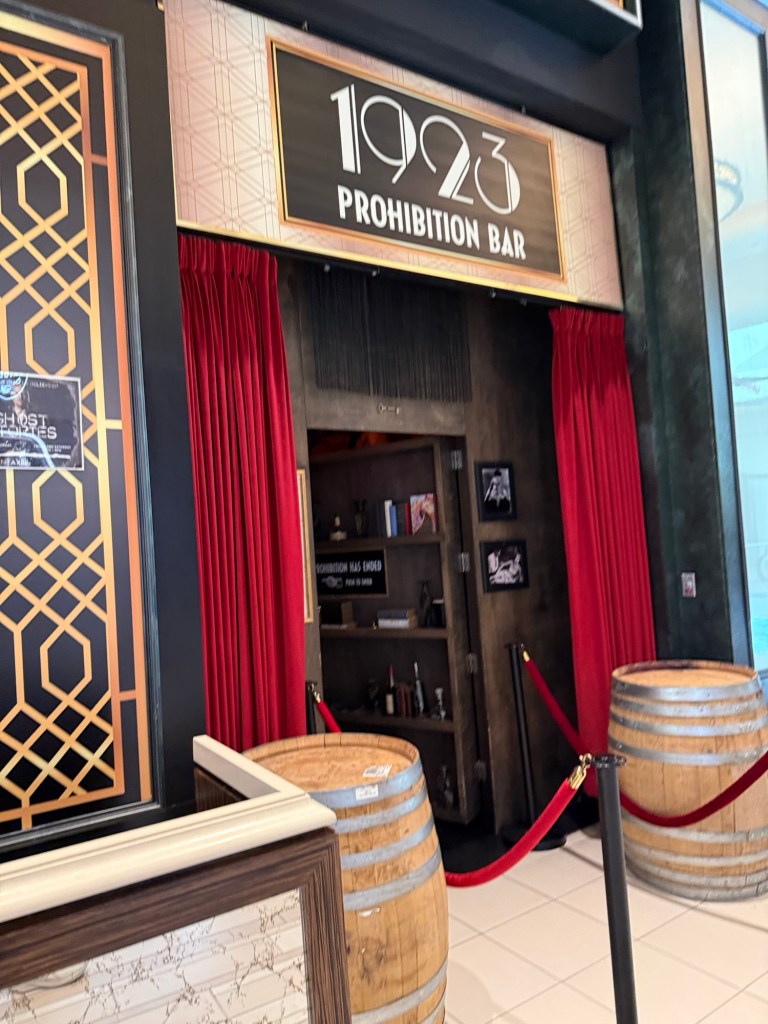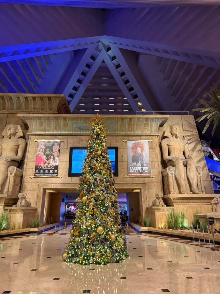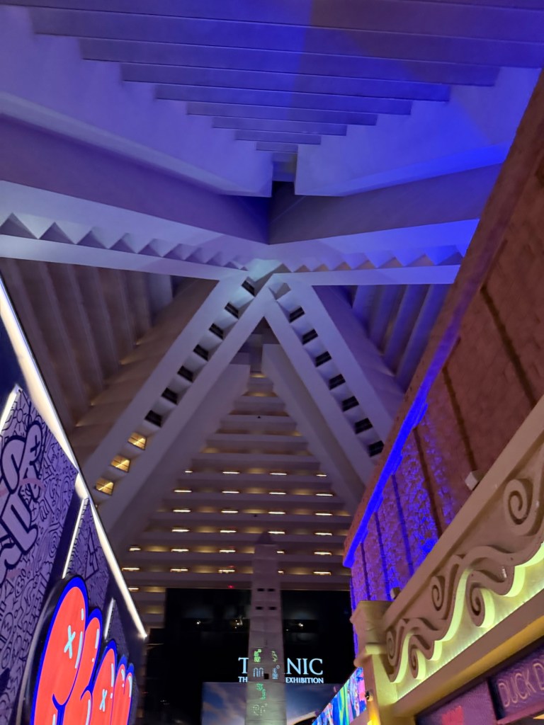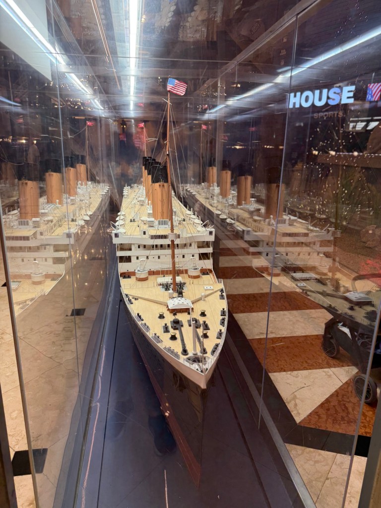 From there, we continued on to Luxor. That massive black pyramid is impossible to miss. Built in 1993, Luxor was designed to bring ancient Egypt to Las Vegas, and the theme is everywhere — statues, columns, and the beam of light shooting into the sky. Inside, we saw the impressive model of the Titanic, which was a really cool detail. We didn’t go into the King Tut exhibit, but just seeing the pyramid, the Egyptian décor, and the Titanic model was worth the walk.