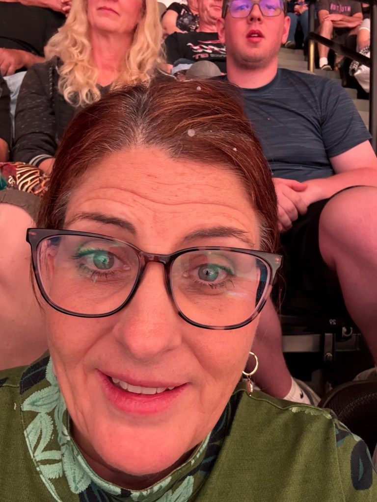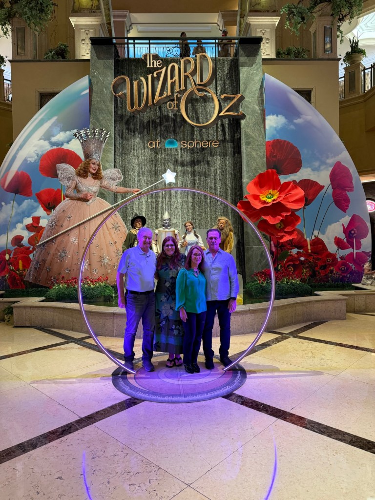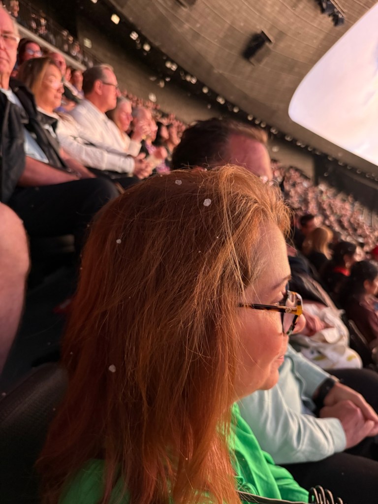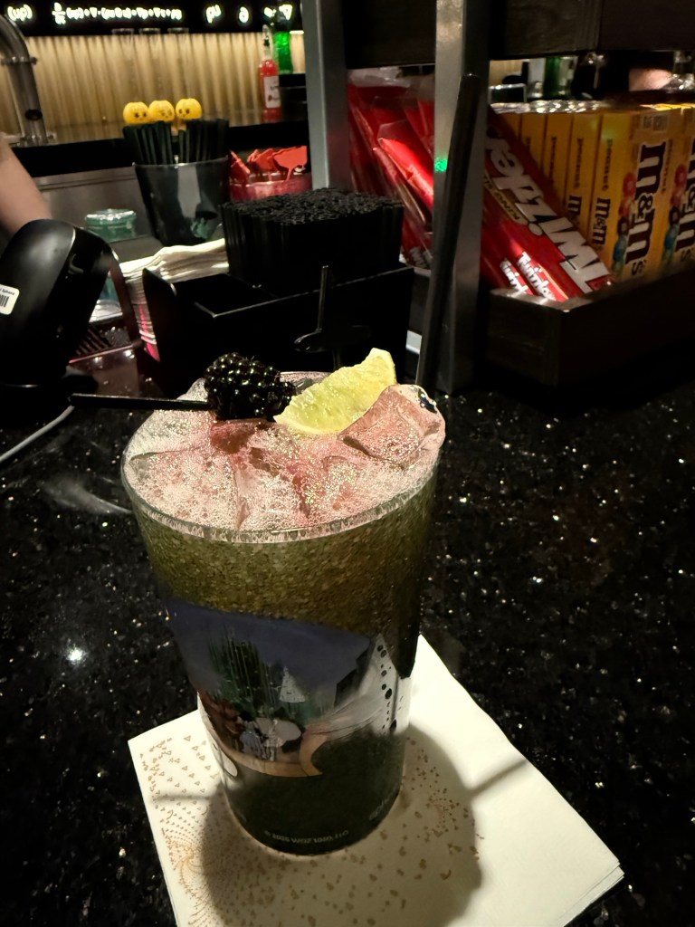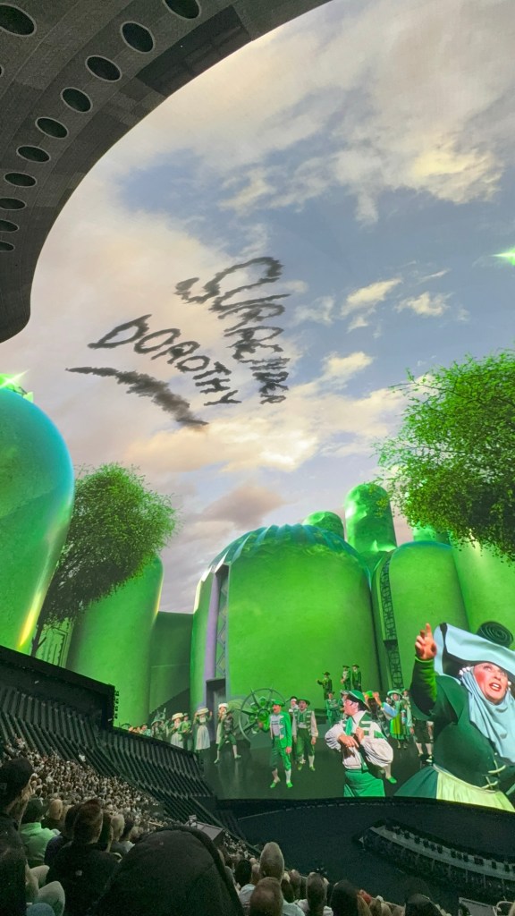 Inside the Sphere, it felt futuristic and enormous. Before the show, we looked at the merchandise. I was doing fine until I saw the Wizard of Oz souvenir cup. I ordered a drink, but it came in a plain one, so I asked to switch. The guy said, “Sure, but it’s a seven-dollar upcharge.” I wanted the cup and the little witch stir stick, so I went for it. When he spun the screen for payment, the lowest tip option was 20 percent for counter service, which drives me crazy. I adjusted it, and he spun it back to see what I tipped. It probably affected the pour, but all I really wanted was the cup. My poor decision meant I had to keep up with that cup the rest of the night!