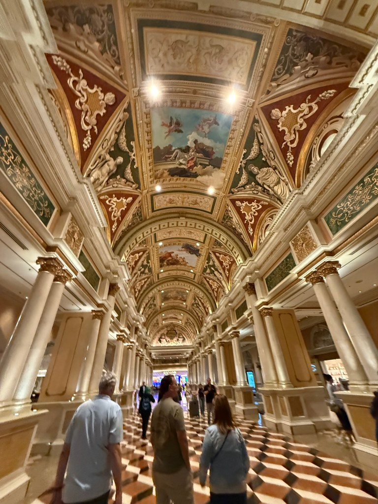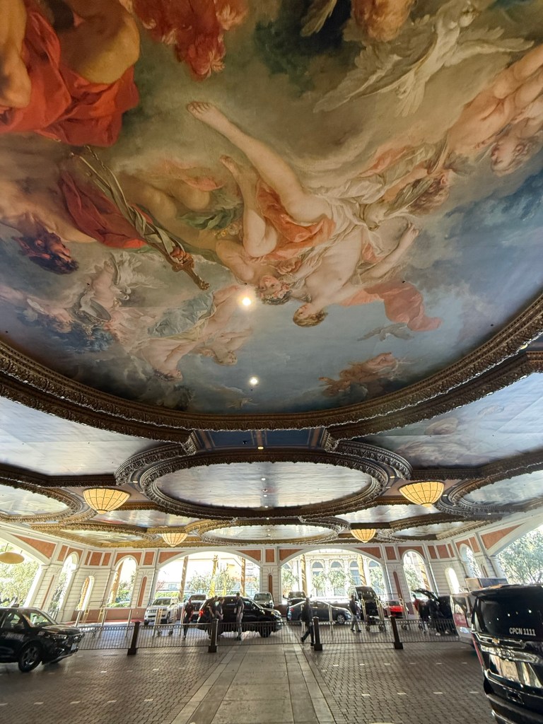 The minute we pulled into the drop-off area of the Venetian, the first thing I noticed was the ceiling above the driveway — completely covered in frescoes. Even before you step inside, it feels grand.
