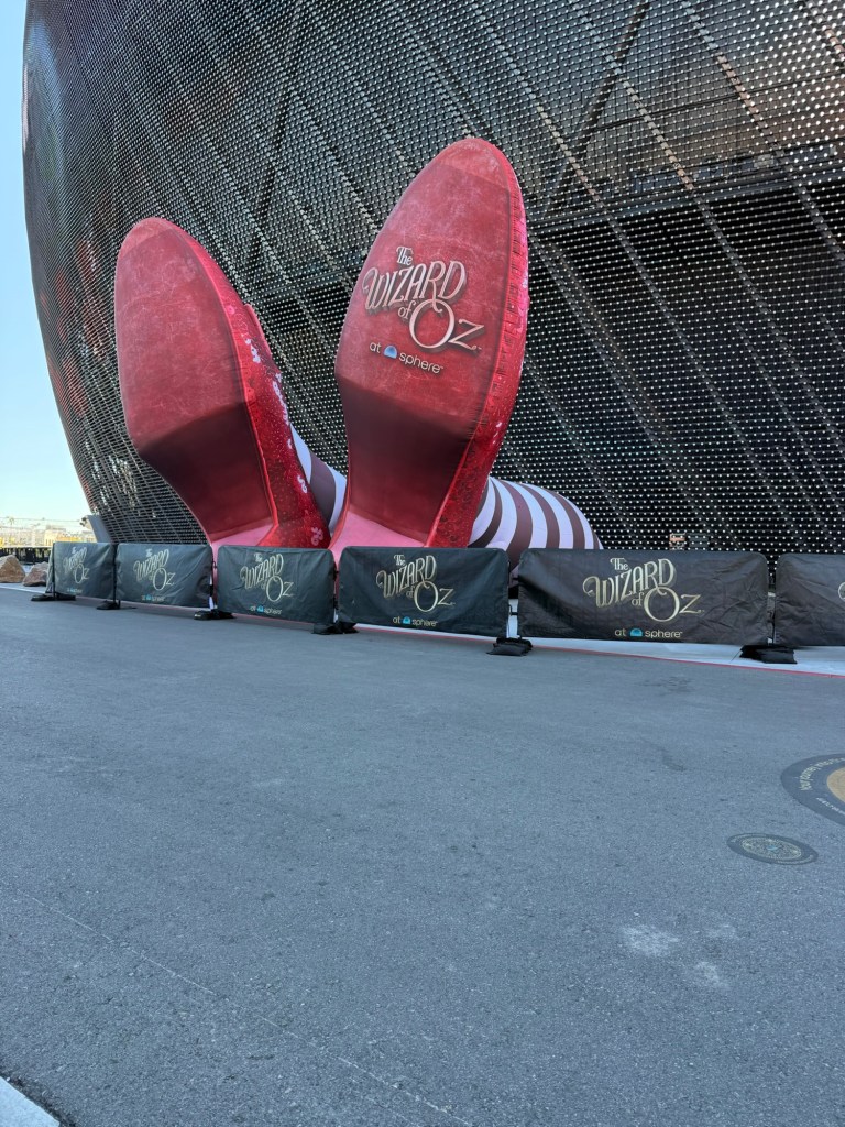 The weather was nice making for a great walk. When we reached the Sphere, we saw the giant ruby slippers outside near the base of the building, a fun nod to the Wizard of Oz theme.