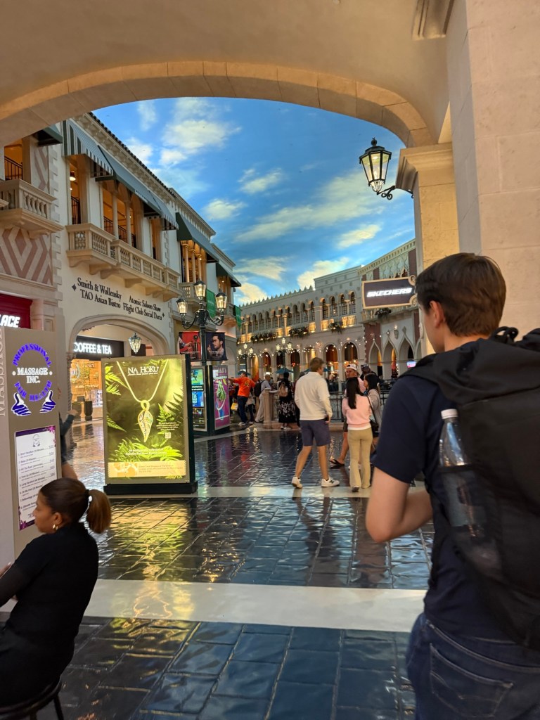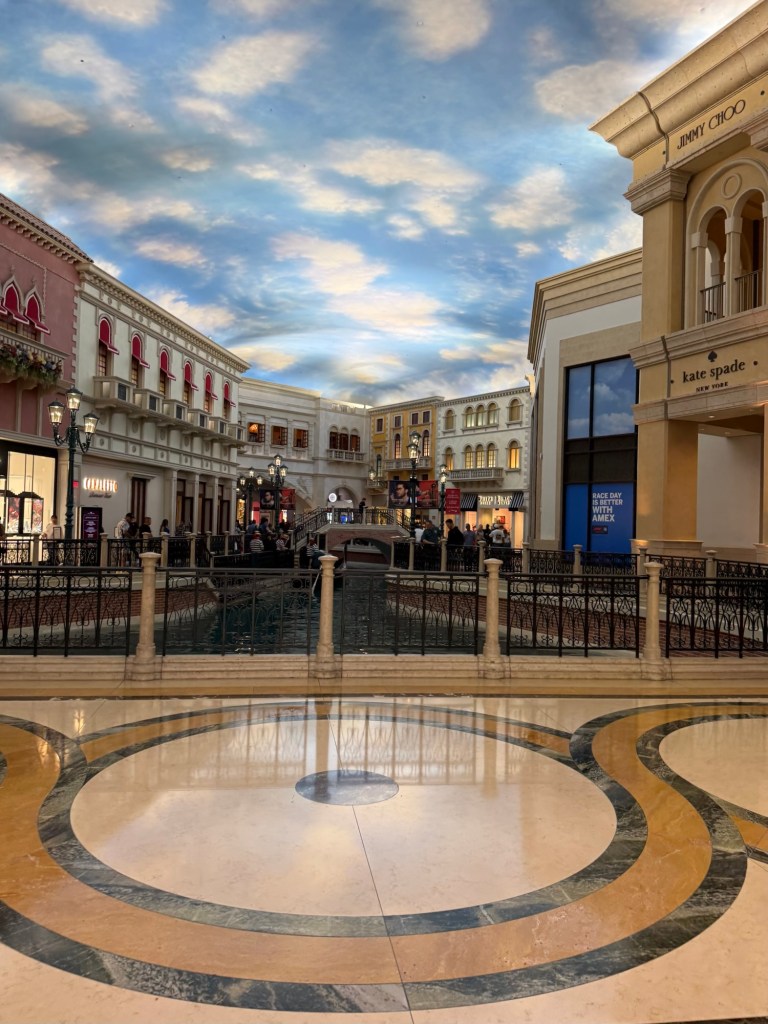 After lunch, Glenn and Tim went to try a dealer-led Texas Hold’em table, and Tim actually won money. Meanwhile, Tracie and I went shopping in the Grand Canal Shoppes. The whole area feels like Venice — painted sky above, cobblestone walkways below, and gondoliers singing as they steer boats through the canals.