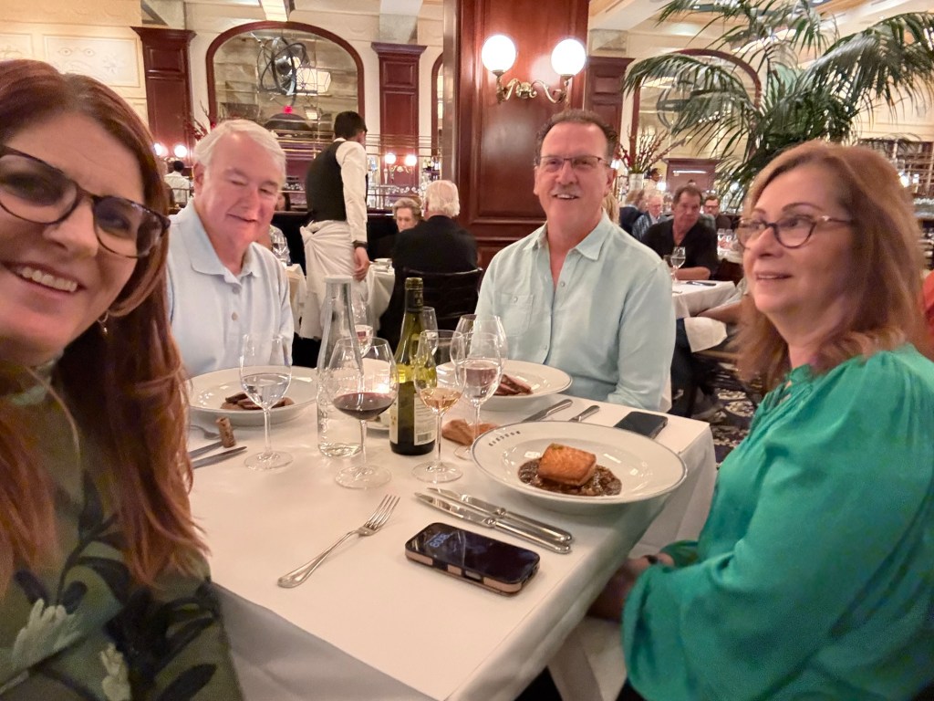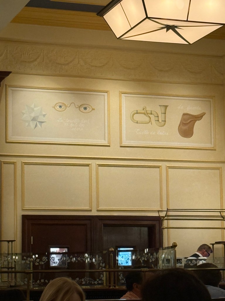 Dinner at Bouchon was worth the effort. It sits up on Level 10 by the pool garden, with outdoor seating that wraps the terrace — one of those spots where you have to double-take to be sure you’re looking at the real sky and not one of the resort’s painted skies. Inside, the ceilings have hand-painted murals by French artist Paulin Paris, and along the upper trim there are whimsical painted phrases that feel like a riddle. Our waiter didn’t know the “answer,” and neither did we — but it was a fun, very French touch. Tim and Glenn had leg of lamb, Tracie ordered salmon, and I had the roasted chicken with a French sauce that was perfect. They brought Tracie a birthday dessert, and we toasted her day.