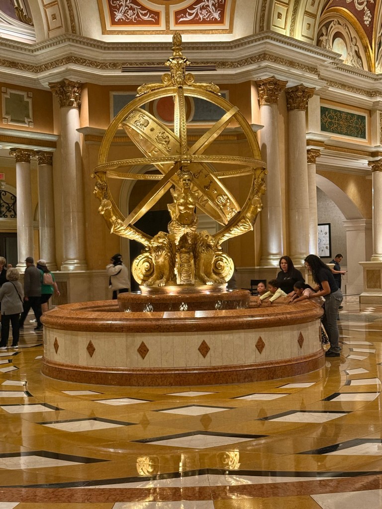 Then you walk through the doors, and there it is: the massive golden Armillary Sphere in the center of the lobby. It’s a globe of interlocking rings surrounded by sculpted figures, modeled after ancient instruments once used to chart the stars. Created by artist Toland Grinnell in 2014, it’s become one of the resort’s most photographed landmarks. I must have taken a hundred pictures of it from every angle throughout the day.