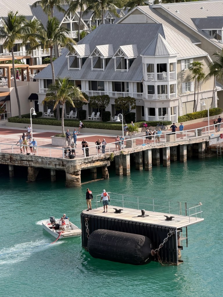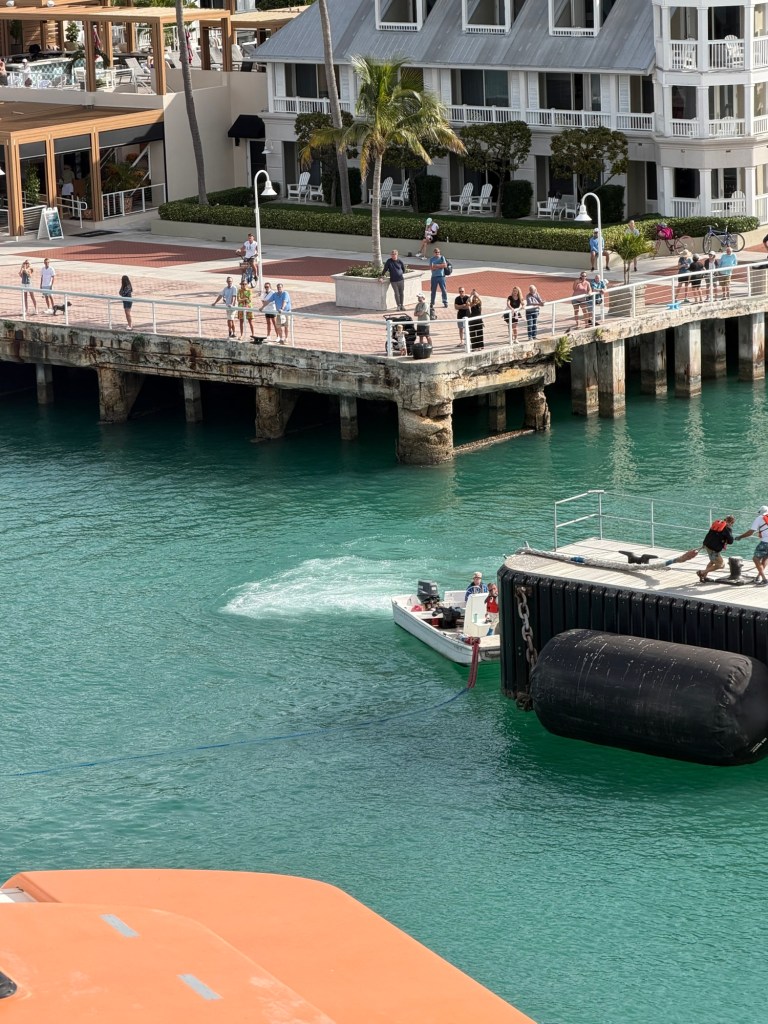 Next, we watched the ship dock. At first, all we could see was the middle mooring. Two men stood on it while a small boat delivered the heavy lines. They tied them off, and once everything was secure, the boat returned and took them away. It was quiet, precise, and surprisingly fascinating to watch.