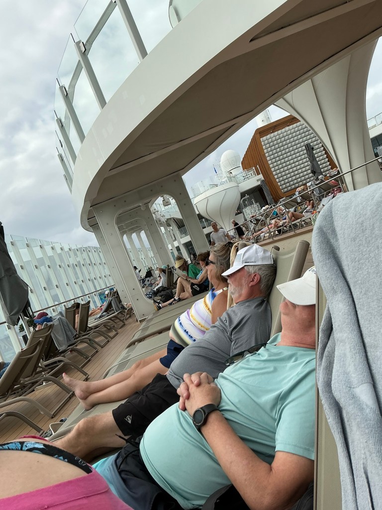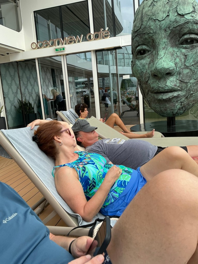 We went back onboard, ate lunch, warmed up, got out of the wind, and found spots by the pool. Books came out. Sunglasses went on. At one point, I looked down the row and realized every single one of us was stretched out in the sunshine, basically asleep.
