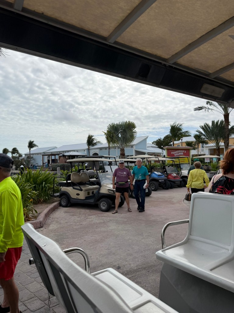 Back to the tram, Debbie got in the back row and sat next to this rude woman who wouldn’t slide over, she made Debbie crawl over her with her beach bag. Then the golf cart sales people came back over and over. Originally I planned to shop the market but changed my mind. We could not wait to get off this island!